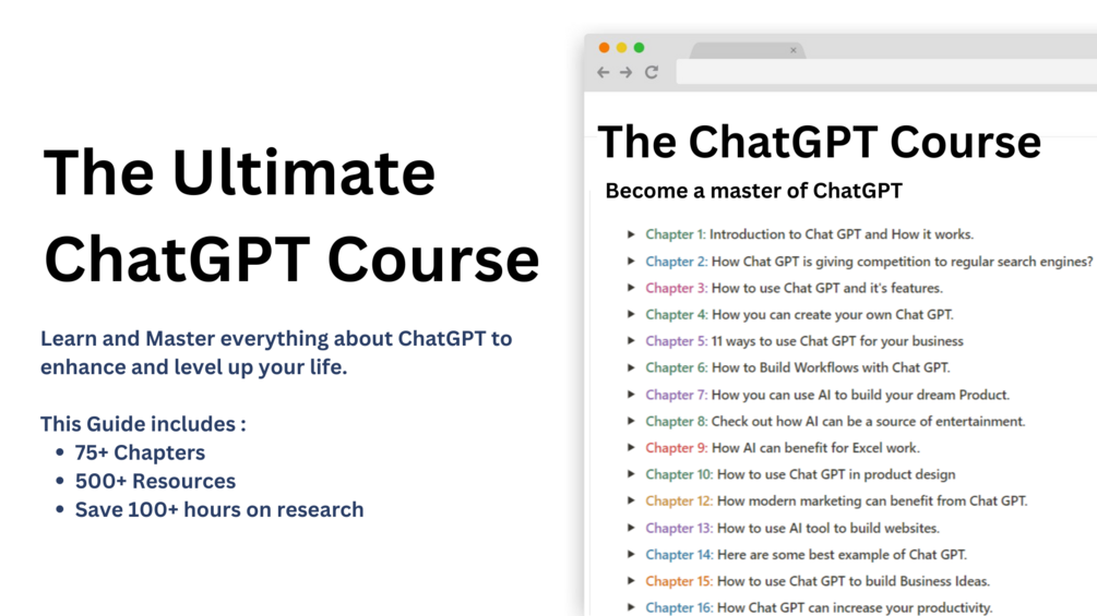 With this course, you'll get 75+ curated chapters with more than 20 hours of content as well as 1000+ AI Tools to help you understand everything about AI and to to become a master of ChatGPT.